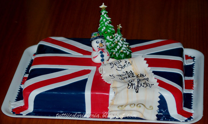 Una torta con bandiera inglese per gli alunni di un corso di inglese: